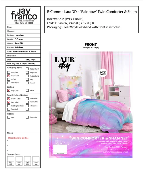 Insert and belly band design for Influencer Lauren Riihimaki’s bedding collection LaurDIY. Comforter and blanket packaging showcases production art of the dimensions of the dielines, verbiage, composition hierarchy for both products. Photography for documentation of samples from over-sea manufactures.